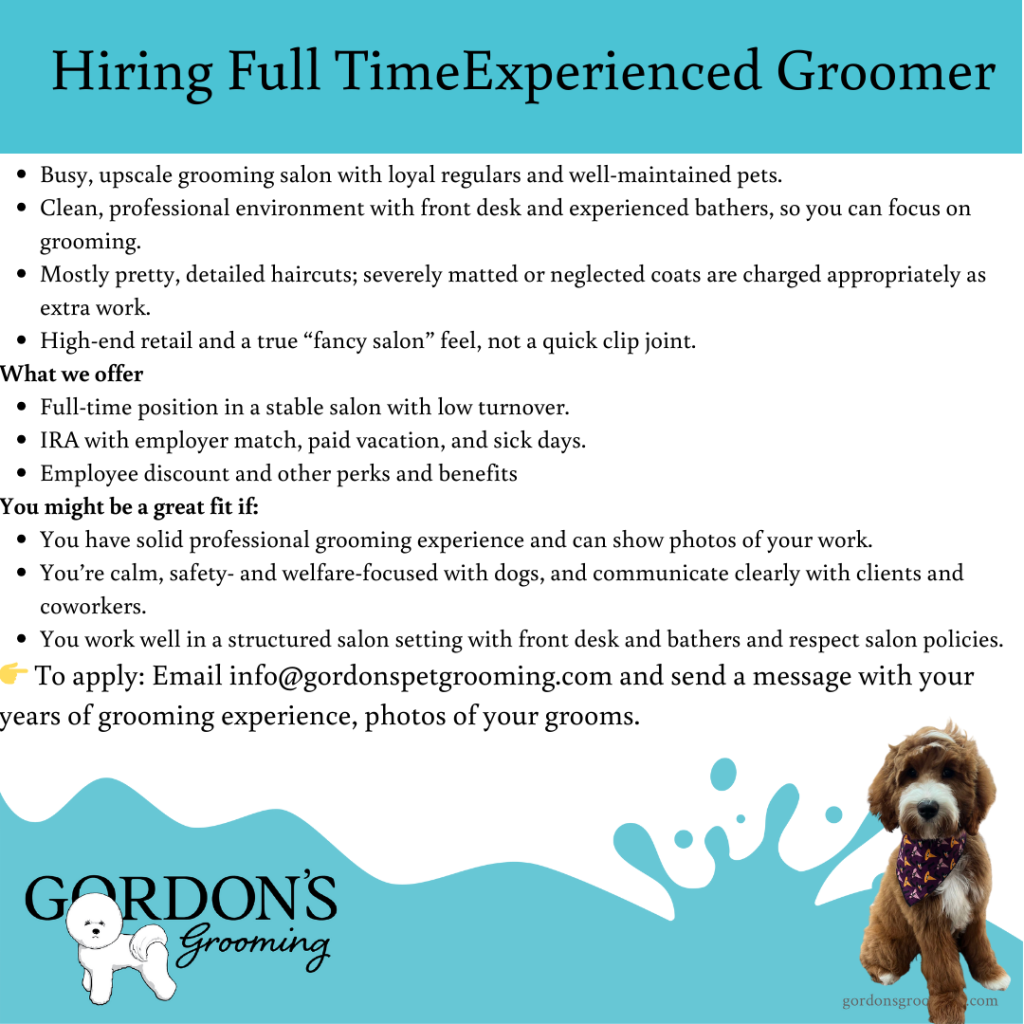 Gordon’s Grooming is BUSY! We are booked about two weeks in advance and have amazing customers! The majority of our customers schedule every 2-8 weeks. We have an amazing salon with support staff, including bather and front desk. We are looking for ONE experienced, kind, knowledgeable groomer to come join our team of professionals.